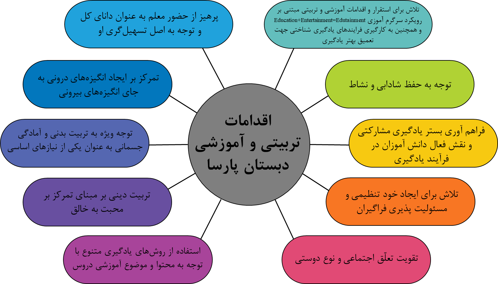 دبستان پارسا مهمترین عامل تاثیر گذار در فرایند تربیت و یادگیری را جذب و حفظ نشاط فراگیران می داند.